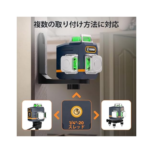 多用途な取り付けオプション:12ライン墨出しレーザーには1/4インチネジ穴を備えており、付属のL字型ブラケットや回転ベース、標準的な三脚に簡単に取り付け可能です。この柔軟な設計により、吊り天井の設置やキャビネットの位置調整など、幅広い用途で正確な作業をサポートします。