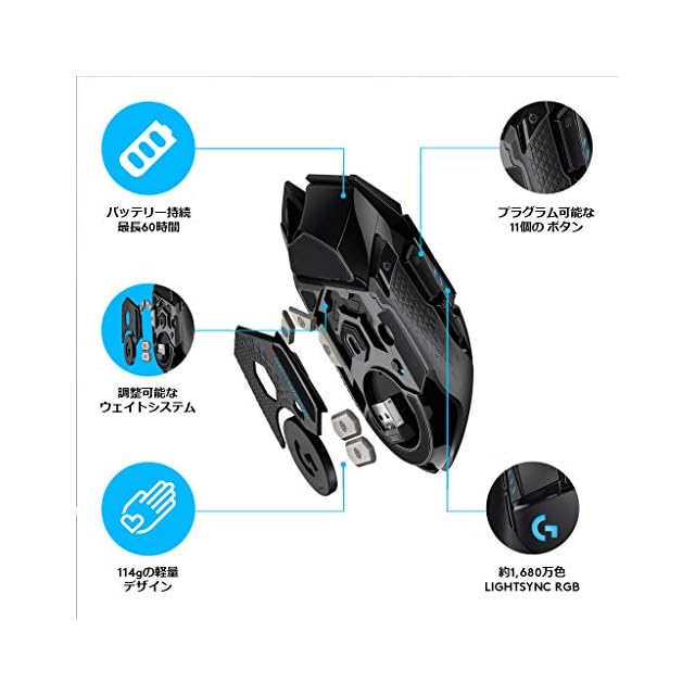 G502ならではのウエイト調整/サイドボタン/高速スクロール性能】調節可能な6 個ウェイト(4gx2、2gx4)をG502内部に様々な構成で配置し、マウスのウェイトとバランスをカスタマイズ可能。 プログラム可能な11個のボタンを装備。 軽量の超高速スクロールホイールは自由に回転して高速かつスムーズにスクロール、標準のノッチ型スクロールにも切り替え可能。