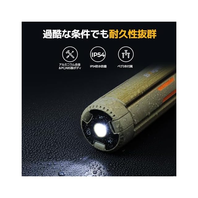 【防水性能IP54】 防水仕様(IP54)で雨や埃にも強く、様々な環境で安心して使用できるアウトドア用ライトです。