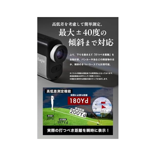 ⭐【高低差測定機能】高低差があるコースでも目標物までの高低差を含めた正確な距離が測れ、ピンポイントに打つ事が可能になりました。高低差機能ON/OFF切り替え可能。【防水性能】大雨の中でも使える防水性を実現。【スペック詳細】測定距離範囲6~660yd/ 5~600M / レーザー波長:905nm(Class I laser)/ クラス1レーザー(不可視) / レンズ倍率:6X / 瞳孔間距離:16mm / 対物レンズ:22mm / 視野角 :7.5°/ 防水性能 / 電池タイプ (定期的な電池交換が必要、充電式ではございません)/ CR2リチウム電池×1本(3V DC) / 本体サイズ:125×77×45mm / 重量:178g / 体温温度:-10°~50°【付属品】●レンズクリーナー●ソフトケース●ストラップ●テスト用CR2リチウム電池●日本語説明書