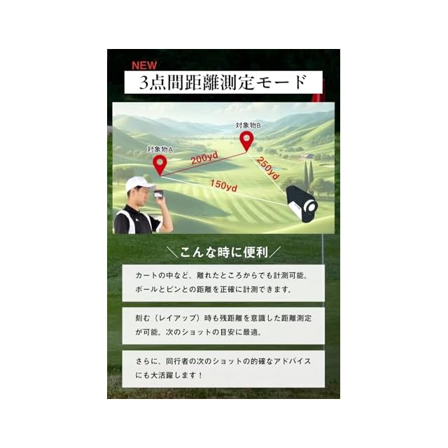 【三点間距離】三点間の距離をそれぞれ測定可能!レイアップする地点からホールまでの距離が一目瞭然!プロのツアー観戦でも楽しさアップ!