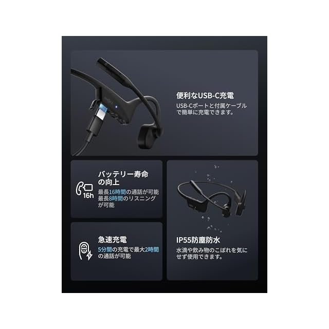 最大16時間連続通話可能:連続通話なら最大16時間、音楽再生なら最大8時間をお楽しみいただけます。5分間の充電で最大2時間の通話が可能、フル充電まで約60分かかります。急な外出や通学通勤、テレワーク、Web会議、在宅勤務、ゲーム、運動に対応できます。