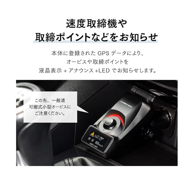 本体に登録されたGPSデータにより新型取締機「レーザー式固定オービス」に対応。GPSデータにより一般道では1キロ手前、高速道では2キロ手前よりお知らせします。また頻繁に移動するレーザー式移動オービスでの取締地点も随時登録を行なっているため、毎月のGPSデータ更新で対応します。