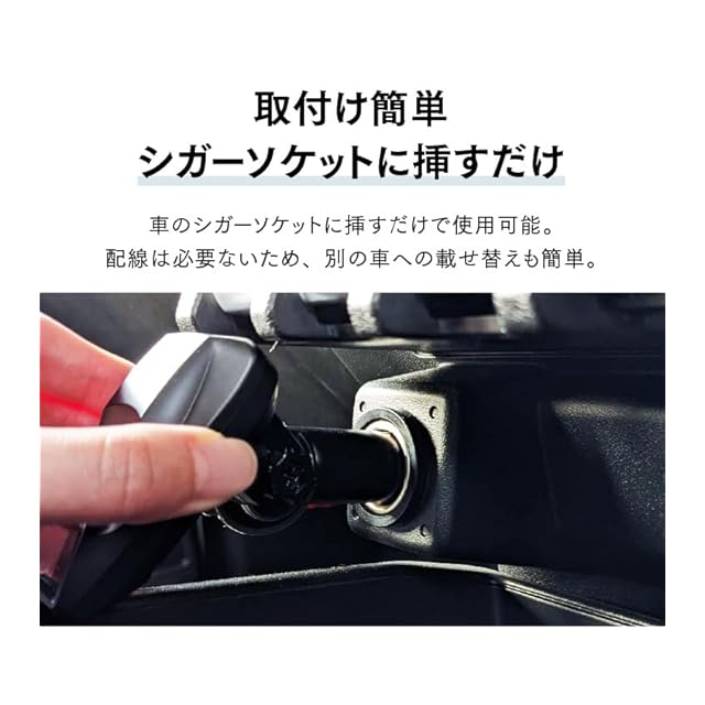 配線不要。車両シガーソケットに挿し込むだけで使用可能でコンパクトサイズなため、持ち運びもかんたん。レンタカーやカーシェアリングでの使用時にも便利!