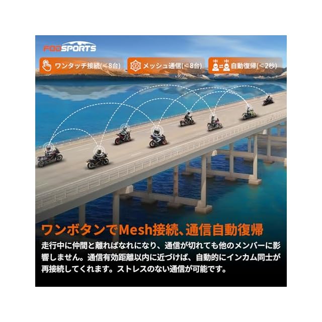 【mesh インカム&ワンタッチ全部接続・8人同時通話・通信自動復帰】このバイク用インカムは、面倒くさい接続手順が不要で、最初にワンボタンでペアリング設定をするだけで、自動的に同じ機種8台同士を接続することができます。繋がる方法が普通のインカムと著しく異なっていて、チェーン式繋がる方法ではなく、網の目状の通信ネットワークを構築、ネットワーク範囲内でお互いが複数の機器と同時につながることにより、常に最適の状態で通信します。 そのため、グループ内でメンバーの一人が途中で抜けても、または通信グループから脱落しても、もしくは障害物や外部電波により通信が切れる場合でも、他の仲間は影響を受けることなく通信を続け、抜けたメンバーが再び通信圏内に入れば、自動的に通話に復帰できます。メンバーが離れたり参加したりするたびにリアルタイムの通話人数が放送されます。