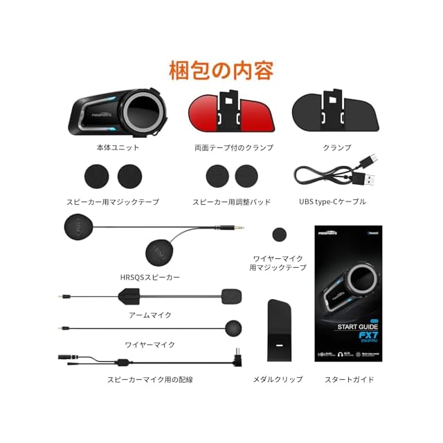 【操作しやすいダイヤル式ボタン・Siri/Google音声アシスタント】FX7本体には、クリック感と触感の強いボタンが2つと大きいダイヤル式のボタンが1つしかなくて、厚いグローブを着装したまますべての機能を簡単に操作することができます。音声認識機能を加えて、Siri/Google音声アシスタントをワンクリックでアクティブ化することで、携帯電話での操作や他のコマンドの実行が不要になって、走行中の危険性が大幅に低減されます。 【様々なヘルメットに装着対応】パッケージにはtype-C~3.5mm転換配線、ワイヤーマイクやアームマイクなど部品が同梱しているので、多種多様なヘルメットに取付けが可能です。