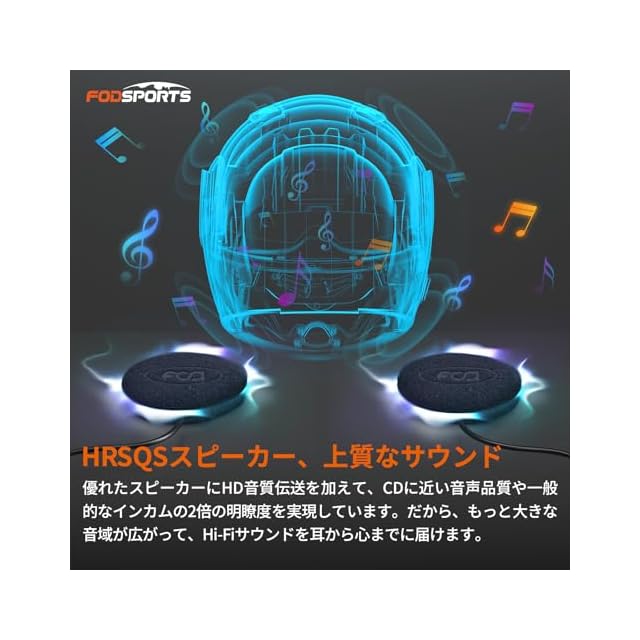 【Qualcomm Bluetooth v5.4チップ・原音再現&Hi-Fiサウンドに包まれる空間】FX7バイクインカムは世界有名メーカーQualcommの先端Bluetoothチップ2枚を配備し、強化されたアンテナを搭載して、データ伝送速度がより高速化、高音質化、低遅延化、接続安定性、消費電力低減などを実現しました(※周囲の障害物や外部電波環境により、異なることもある)。同梱HRSQSスピーカー(直径:40mm厚さ:10mm)には、シルクダイヤフラム材質、優れた生物振動板及びドライバーユニットを採用し、音の音色や解像度が標準スピーカーより2倍増になりました。本インカムは良い再生システムでリスニングルームのようなリアルな臨場感を作り出すことで、CDレベルのステレオ効果で、音楽鑑賞を提供します。大音量にしても、低域から高域までクリアな音質を保ち続けられました。