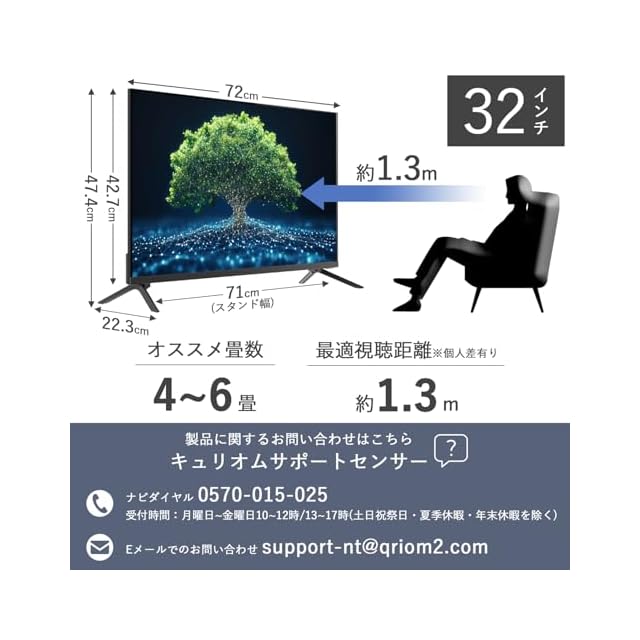 ✅【商品仕様】◇本体寸法:[スタンドなし]720×68×427mm [スタンドつき]720×223×477mm ◇本体質量:[スタンドなし]3.8kg [スタンドつき]3.9kg ◇画面サイズ:32V型 ◇解像度:1366×768 ◇コントラスト比:900:1 ◇視野角(標準値):左右約178°/上下178° ◇応答速度:8ms ◇チューナー:地上デジタル×2、BS、110度CSデジタル×2(ダブルチューナー)※1つは視聴専用・2番組同時録画は非対応 ◇音声出力(スピーカー):6W+6W ◇Bluetoothバージョン:5.1 ◇壁掛け寸法:VESA規格200×200mm ◇USB端子:USB2.0×2 ◇定格電源:AC100V-240V(50/60Hz) ◇消費電力:55W ◇付属品:リモコン、リモコン用単4形乾電池×2(動作確認用)、miniB-CASカード、miniAV交換アダプター、スタンド、スタンド固定ネジ×4、書付き取扱説明書