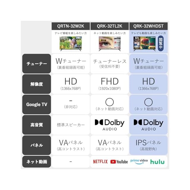 ✅【GoogleTV搭載】「リアルタイムでテレビ番組を見たい」「YouTubeやNETFLIX、primevideoなどをスマホで見てる」そんな方におススメ、Wチューナー・Google TVを搭載した液晶テレビ。ネット対応モデルとして、地上波はもちろん、豊富なVOD(動画配信サービス)に対応しているので、お好きなコンテンツを思いのままに、大画面で楽しめます。