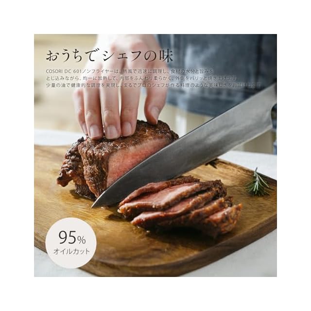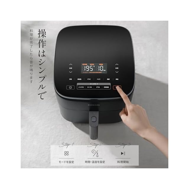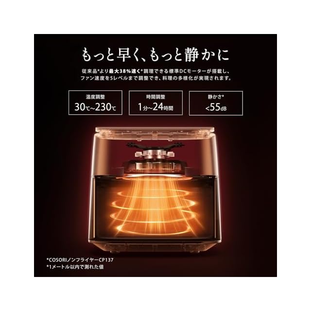 【DCモーター搭載】エネルギー効率が高く、静音性に優れたDCモーター搭載。従来品よりも最大38%速く調理できる、貴重な時間を節約できます。COSORIの独自技術により、最高230℃までの温度設定が可能になります。熱風で迅速に調理し、食材の水分と旨みをとじ込みながら、均一に加熱して内部をふんわり柔らかく、外側をパリッと焼き上げます。暑い日に揚げ物を作るストレスも解消!