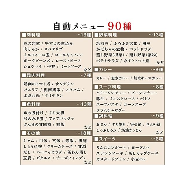 【自動メニュー90種】ネット販売限定モデルのみ搭載の自動メニューもあり、バラエティ豊かな食事がボタン一つで簡単にできます。また、自動メニューと連動したレシピブックも付属。レシピサイト用の二次元バーコードからスマホ、タブレットでも簡単にレシピを見ることができます。