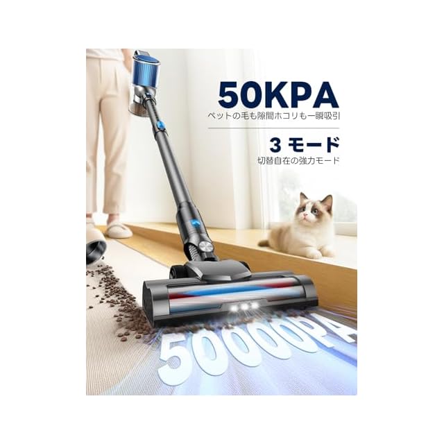 【50KPa超強吸引力&3段階モード&完全自立式設計】業界トップの50KPa超強吸引力が、カーペットに埋もれたペットの毛やソファの隙間の細かいゴミまでしっかり吸引。3段階の吸引力調整(強/標準/エコ)で、フローリングから厚手の絨毯まで、あらゆる床材に最適なパワーで対応可能。さらに独自開発の自立式設計!従来品の「方向転換でヘッド浮き上がり」を完全解消。手を離しても自立するから、掃除中に足で押さえる必要がなく、ストレスフリーで楽々操作。壁掛けスタンド不要のコンパクト設計で、収納時もスペースを取らず、狭い日本家屋に最適!軽量ボディ(2.4kg)に自走式ローラーブラシを搭載。女性でも片手でラクラク操作でき、毎日のお掃除が劇的に軽量化!プロ級の吸引力を実現した、まさに「楽々掃除」の決定版!