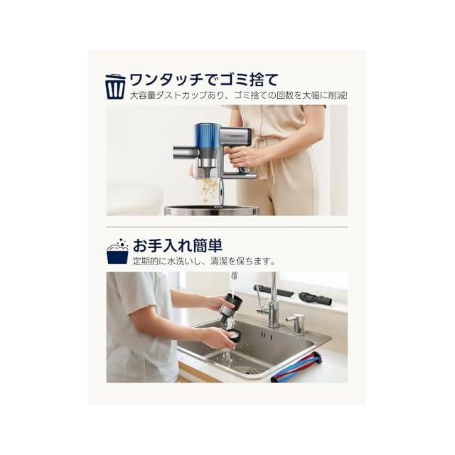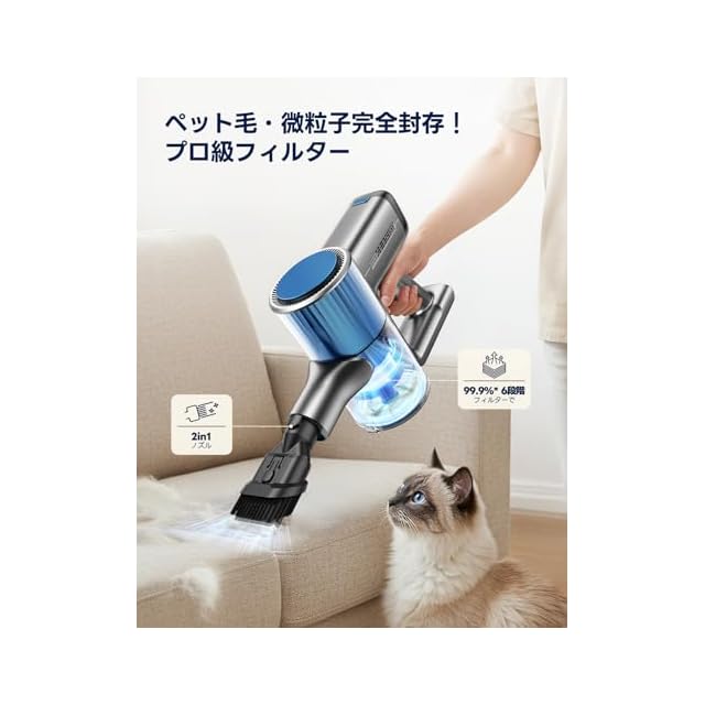 【6重濾過システム&0.4L大容量&お手入れ簡単】ペットの毛髪やアレルゲン、0.3 ミクロンの微細ほこりまで 99.99% 捕集する 6 層フィルターシステムを搭載し、赤ちゃんのいる家庭やペット飼いの方でも清掃中にクリーンな空気を保ちながらお掃除できます。遠心力サイクロン技術により、ワンルームから 2LDK までの狭い住宅空間でも長時間安定した吸引力を維持し、隅々までゴミを吸い込みます。0.4L の大容量ダストカップは、頻繁なゴミ捨ての手間を減らし、ワンタッチで蓋を開けて簡単に排出可能。汚れが目立った場合は本体ごと分解して水洗いが可能で、ダストカップの細かい部分まで洗い流せるため、長期使用しても吸引力が低下しにくくなっています。定期的に水洗いをすることで、ほこりやペットの毛髪が詰まるのを防ぎ、常に衛生的かつ高性能な状態でお使いいただけます。