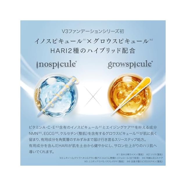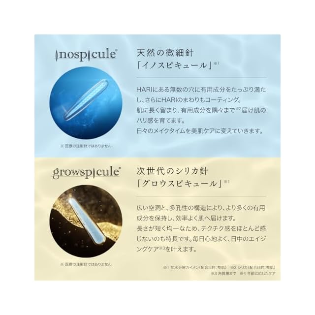 ✨【進化したHARIのハイブリッド配合】 イノスピキュール(シリカ99.8%の美容針)とグロウスピキュール(シリカ100%の美容針)を配合し、有用成分を長時間拡散。 メイクをしながらスキンケアができる、画期的なファンデーションです。