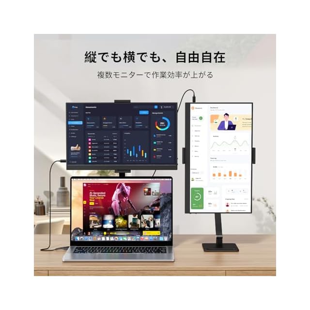 【ケーブル1本で簡単接続】付属のUSB Type-Cケーブルを使用することで、ケーブル1本でモニターとデバイスを接続できます。外付けの電源は不要で、ノートPCやスマートフォンから直接電源を供給し、映像や音声を同時に伝送します。特にビジネスシーンやミーティングにおいては、外部モニターを持ち込むだけで大画面でプレゼン資料や書類を簡単に共有できます。接続時にはモニターが自動で輝度、コントラスト、音量を調整し、省電力モードに入ります。※接続にはType-C3.1またはThunderbolt3/4のフル機能ポートが必要です。