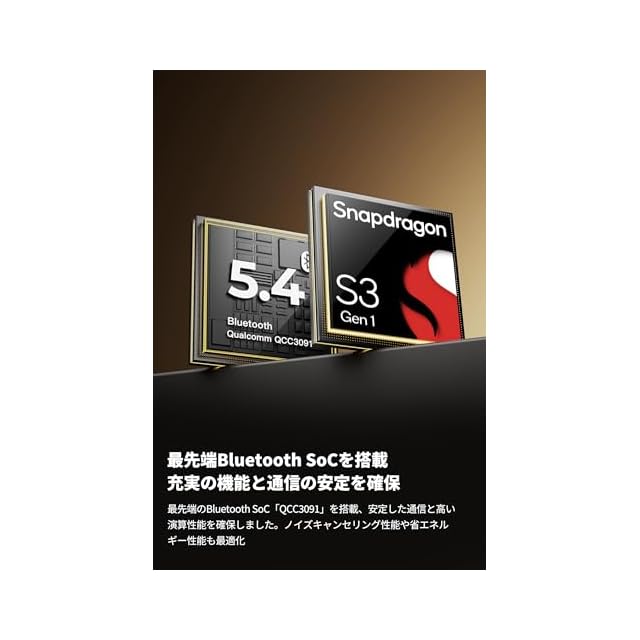 【最先端QCC3091+Bluetooth 5.4採用、遅延ゼロ感覚、安定のその先へ 】 搭載されたQualcomm製の先端チップQCC3091は、Snapdragon Sound S3 Gen1プラットフォームに準拠する、超低遅延と高音質伝送を両立した次世代プロセッサー。省電力化と電波干渉耐性も飛躍的に向上しました。人混みや地下鉄などでも接続が途切れにくく、音楽も通話も途切れない信頼性を備えています。60msの超低遅延でゲーム・動画鑑賞時の違和感を大幅に低減。ストレスフリーな操作感があなたの毎日を快適にアップデートします