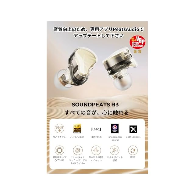 商品名:SOUNDPEATS(サウンドピーツ) H3 ワイヤレスイヤホン 【VGP2025 SUMMER 金賞】 HiFi音質 デュアルBA+12mmDD 3ドライバー 55dBノイズキャンセリング ロスレス/ハイレゾ aptX Lossless/LDAC Snapdragon Sound QCC3091 Bluetooth 5.4 マルチポイント 専用アプリ IPX5防水 ブルートゥース カナル型