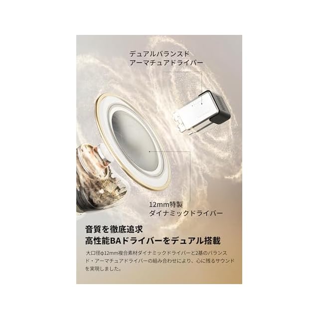【デュアル高性能BAドライバー+大口径φ12mm複合素材ダイナミックドライバーの組み合わせで、ワイヤレスでHiFi音質を実に体験可能】2基の高性能バランスド・アーマチュア(BA)ドライバーを搭載し、高域の繊細さと中高域の明瞭さを圧倒的な解像度で再現。ボーカルや楽器の細かなニュアンスまで忠実に描き出します。低域には、φ12mmの特製PU+ウール複合素材振動板を用いたダイナミックドライバーを採用し、弾力ある深みと自然な中低音を実現。3基のドライバーを組み合わせたハイブリッド構造により、各帯域を適切に再生します。さらに綿密なチューニングを施すことで各帯域のつながりと一体感を生み出し、音場の奥行きと臨場感をも再現します。専用アプリを使えば、イコライザー機能でお好みでカスタマイズすることも可能です