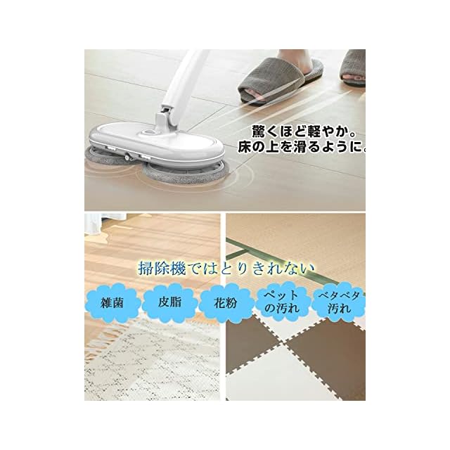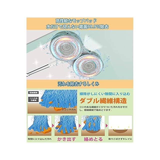 【くり返し使えるモップパッド6枚付き、とっても経済的】特殊繊維のモップパッドが6枚付き、回転しながら細かい汚れをしっかり絡めとります!吸水性、耐摩耗性、耐久性に非常に優れ、床面を傷つけずお掃除出来ます。電動モップのヘッドから取り外して水洗いをすれば、何度も繰り返し使えるのでとっても経済的!。(手洗い、洗濯機洗い可能)