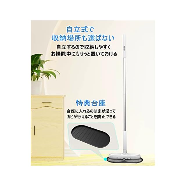 【高い操作性でラクラクお掃除】回転モップのヘッドの角度が自由自在に動かせます。汚れの溜まりやすいお部屋の隅もしっかりキレイに。充電式なのでコードレス操作ができるため、コードに邪魔されず、どこでも自由に掃除ができます 。自立するから収納しやすく、お掃除中もサッと置いておける。また、回転モップ用台座を付属されて、湿っていたモップパッドを床に直接接触するのを避けて、カビが生えるのを防止することができます。