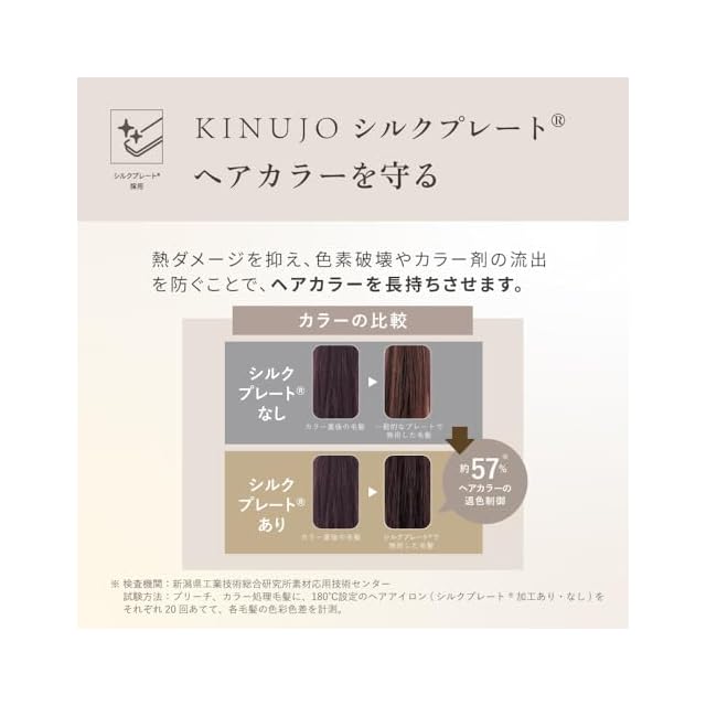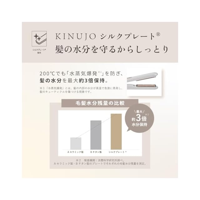【KINUJOシルクプレート】 POINT1 髪の水分を守るからしっとり 200度でも「水蒸気爆発」を防ぎ、髪の水分を最大約3倍保持。 ※「水蒸気爆発」とは、髪の内部の水分が高温で急激に蒸発し、髪のキューティクルを傷つける現象です。
