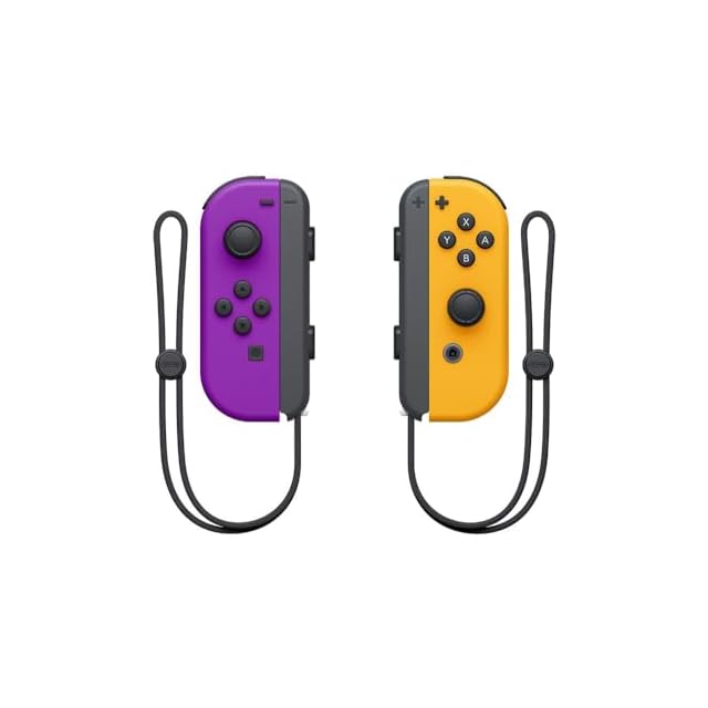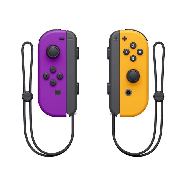 「Joy-Con(L)ネオンパープル」と「Joy-Con(R)ネオンオレンジ」に「Joy-Conストラップ(ブラック)」が2個付いたセットです。
