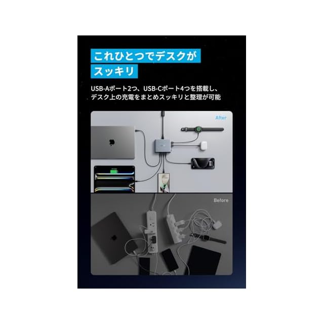 これひとつでデスクがスッキリ:USB-Aポート2つ、USB-Cポート4つを搭載し、デスク上の充電をまとめスッキリと整理ができます。