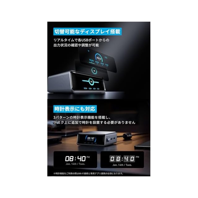 時計表示にも対応:3パターンの時計表示機能を搭載し、デスク上に追加で時計を設置する必要がありません 時計機能をご利用の際はWi-Fi接続と専用アプリ連携が必須になります) 。