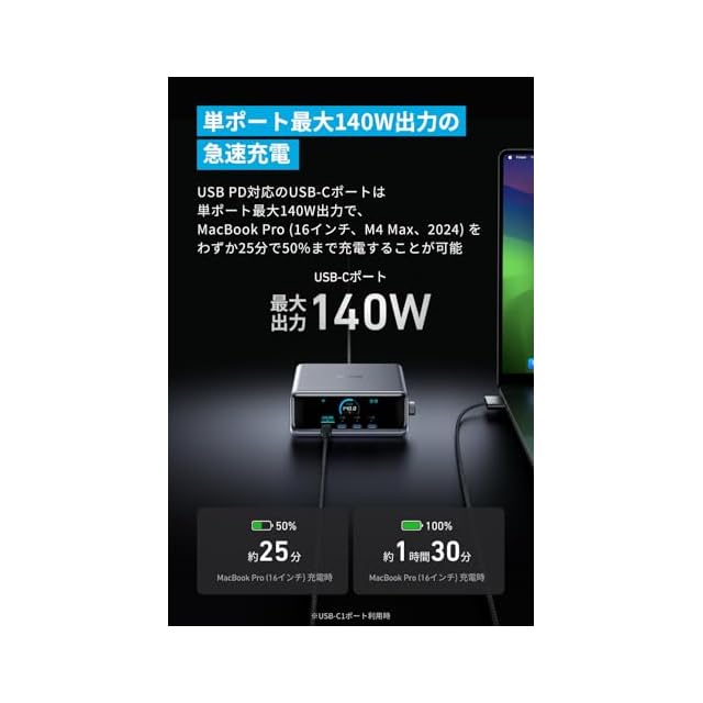 単ポート最大140W出力の急速充電:USB PD対応のUSB-Cポートは単ポート最大140W出力で、16インチのMacBook Proをわずか25分で50%まで充電することが可能です (充電時間はAnker調べ。140W出力はUSB-C1 ポート利用時のみ) 。