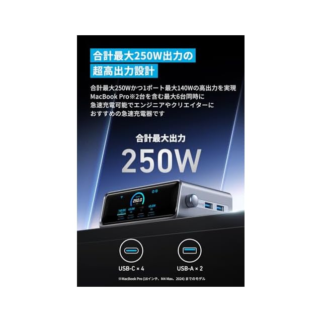 合計最大250W出力の超高出力設計:合計最大250Wかつ1ポート最大140Wの高出力を実現。MacBook Pro2台を含む最大6台同時に急速充電可能で、エンジニアやクリエイターにおすすめの急速充電器です。
