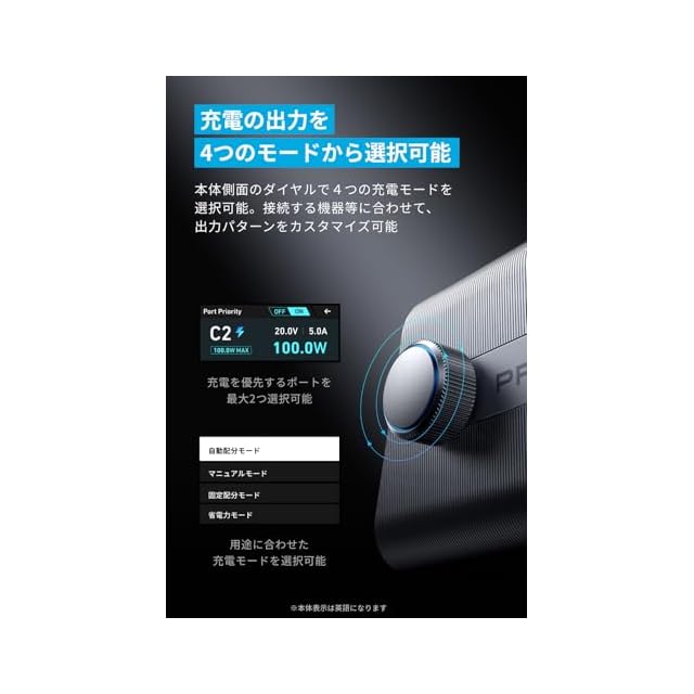 4つのモードから選択可能:本体側面のダイヤルで4つの充電モードを選択可能。接続する機器等に合わせて、出力パターンをカスタマイズできます。