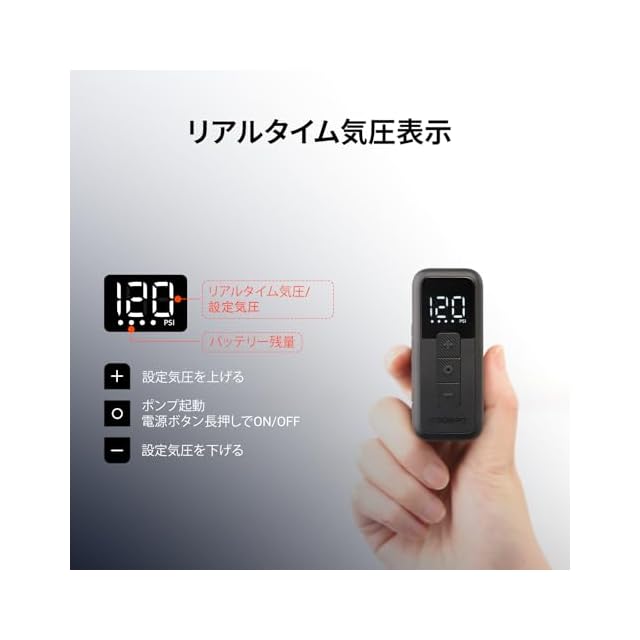 デジタル表示&自動停止:気圧とバッテリー残量をリアルタイムで表示するLCDスクリーンを搭載。±1以内の高精度センサーにより、設定した空気圧に達すると自動で停止し、過充填を防止します。
