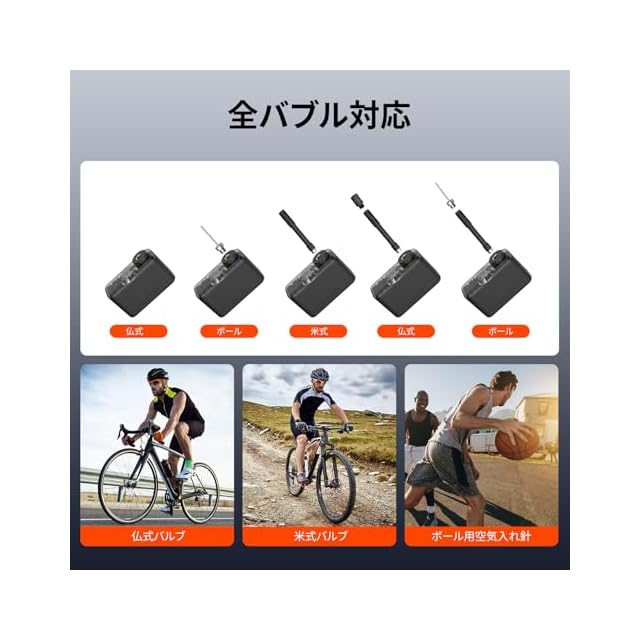多用途ノズルセット付属:仏式・米式バルブに対応する専用アダプターに加え、スポーツボール用のニードル、延長ホースも付属。ロードバイク・マウンテンバイク・通勤用自転車はもちろん、バスケットボールやサッカーボールにも対応。