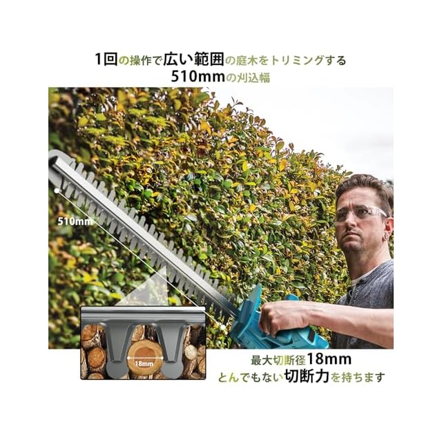 商品名:ヘッジトリマー 充電式 電動ヘッジトリマー 18Vマキタバッテリー対応可能 刈込幅510mm/切断径18mm 両刃駆動 高速往復刈り 剪定 トリマー 電動トリマー ガーデントリマー 生け垣トリマー 剪定バリカン 生垣バリカン 植木バリカン 草刈りバリカン 充電式 枝切り 電動 コードレス 軽量 【大容量バッテリー2個と充電器付属】 日本語取扱説明書