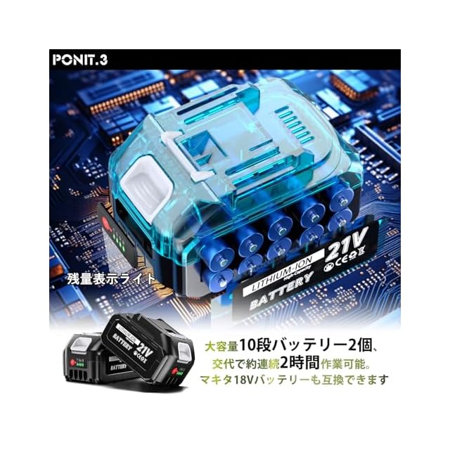【大容量バッテリー2個/残量表示LEDライト】大容量リチウムバッテリー2個を付属する電動ヘッジトリマーです。使用場所を選ばず、フル充電されたバッテリー1個分の作業時間は約1時間ほど、2個交代で2時間連続作業可能。マキタ18Vバッテリー(BL1820b、BL1830、BL1840、BL1850、BL1860B)と互換性があり、バッテリーに残量表示ライトがついていますので、作業時間を把握できます。