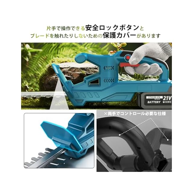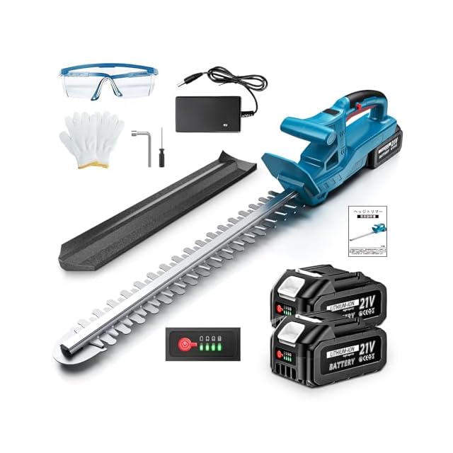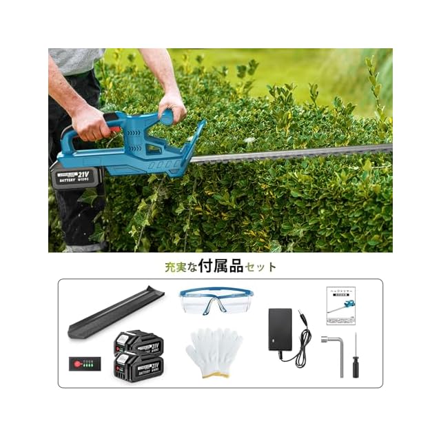 【付属品とアフターサービス】付属品:ヘッジトリマー本体x 1、ブレード収納ケースx 1、大容量リチウムバッテリーx 2、充電器x 1、保護メガネx 1、手袋x 1、ドライバーx 1、レンチx 1、日本語取扱説明書x 1 。出荷前に厳格な品質検査を行われますが、万が一、お手元に届いた商品に欠陥がある場合は「注文履歴」➡「出品者に連絡する」。担当者が24時間以内返信し、真摯に対応いたします。