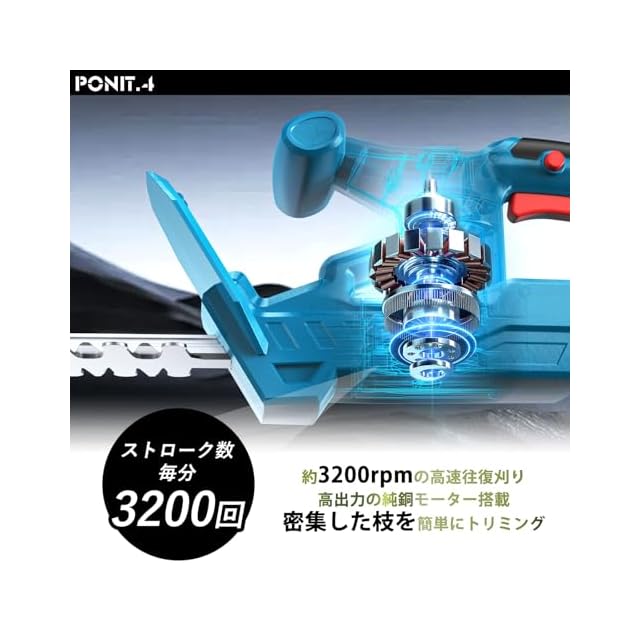 【強力純銅モーターと高切断力ブレード】庭木剪定トリマーには高出力の純銅モーターが搭載されており、約3200rpm/minの回転速度を提供し、太くて密集した枝にも効果的に対応、直径18mm未満の枝なら、あらかじめ剪定しなくてもそのままトリミングが可能です。二面研磨ブレードは高速往復刈りを通じて高い切断力を発揮し、固い枝でもゆっくり切り込めば切断できます。