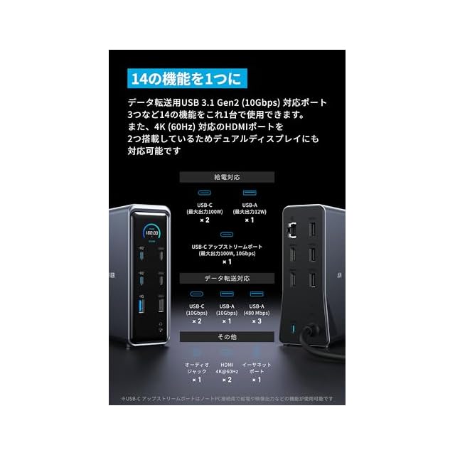 商品名:Anker Prime ドッキングステーション (14-in-1, Dual Display, 160W) USB PD最大100W出力対応USB-Cアップストリームポート Built-in GaN AC-DC電源装置搭載 10Gbps高速データ転送 4K 60Hz HDMI 2.0ポート 1Gbpsイーサネットポート オーディオジャック MacBook Dell スマホ他対応