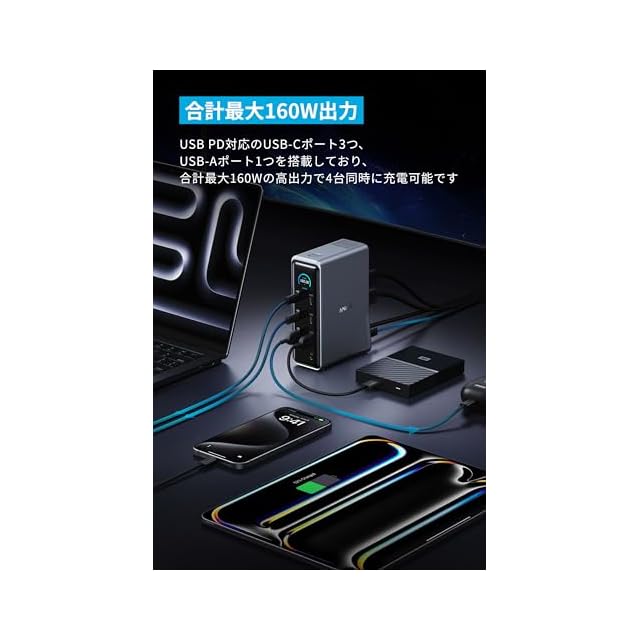 合計最大160W出力: USB PD対応のUSB-Cポート3つ、USB-Aポート1つを搭載しており、合計最大160Wの高出力で4台同時に充電可能です。