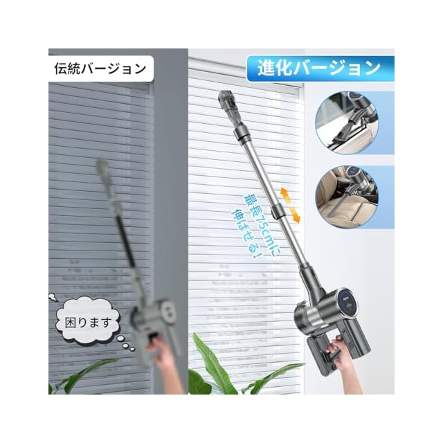 「LED液晶ディスプレイ・伸縮パイプ・5重濾過システム」LED ディスプレイ画面には、バッテリー残量だけでなく、掃除機の動作状態も表示されます。Airpher掃除機コードレスは伸縮可能パイプを採用しており、身長合わせてパイプ調整できます。パイプの部分は最長67センチに伸ばせます。高いところにも簡単にお掃除できます。サイクロン式の掃除機 業務用で、遠心力を利用し、空気とゴミをすばやく分離でき、強力吸引力を保ちながら、ハイパワーで素早かに掃除を完成します。また、5重濾過システムの構造で、排出される空気がクリーンになり、人体にも環境にも優しいサイクロン掃除機です。