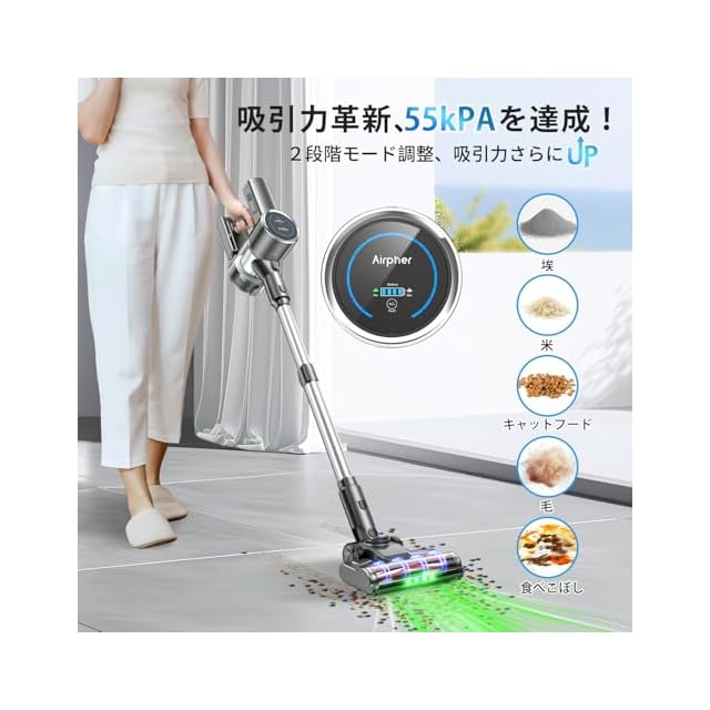 掃除機 コードレス 【55000pa強力吸引・自立式・新登場!】Airpher コードレス掃除機 強力 55kPA 60分連働 LED液晶ディスプレイ 軽量 低騒音 伸縮パイプ 5重濾過システム 1L集塵 自立可能 着脱式バッテリー 壁掛け収納 充電式 左右180°上下90°回転 LEDライト4つ付 ワンタッチゴミ捨て ソファー/卓上/本棚/サッシ/車 年内掃除 父の日 プレゼント