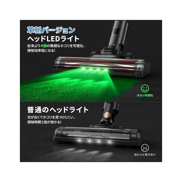 「進化LEDライト付き・回転やすい・低騒音」革新されたヘッドLEDライト4ち搭載され、従来より4倍の微妙なホコリを可視化、ソファやベッドの下、家具の裏など日中でも暗い場所掃除しやすく配慮されています。掃除機は左右に180°、上下に90°回転するヘッドが利用されており、低い位置の掃除を行うとき、床に対して平行に近い角度までヘッドが曲がり、掃除を快適に行え、最大限の機動性を提供します。低騒音化設計で気になる運転音を軽減します。夜や早朝のお掃除にもおすすめします。