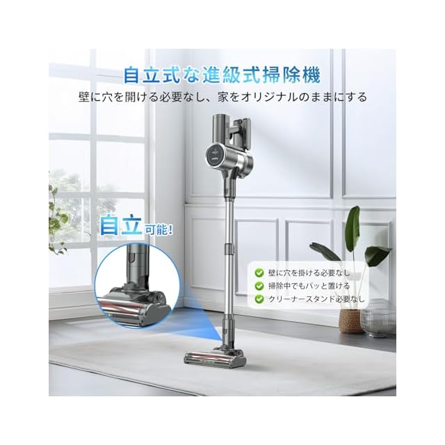 商品名:掃除機 コードレス 【55000pa強力吸引・自立式・新登場!】Airpher コードレス掃除機 強力 55kPA 60分連働 LED液晶ディスプレイ 軽量 低騒音 伸縮パイプ 5重濾過システム 1L集塵 自立可能 着脱式バッテリー 壁掛け収納 充電式 左右180°上下90°回転 LEDライト4つ付 ワンタッチゴミ捨て ソファー/卓上/本棚/サッシ/車 年内掃除 父の日 プレゼント
