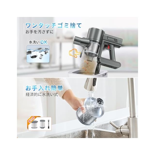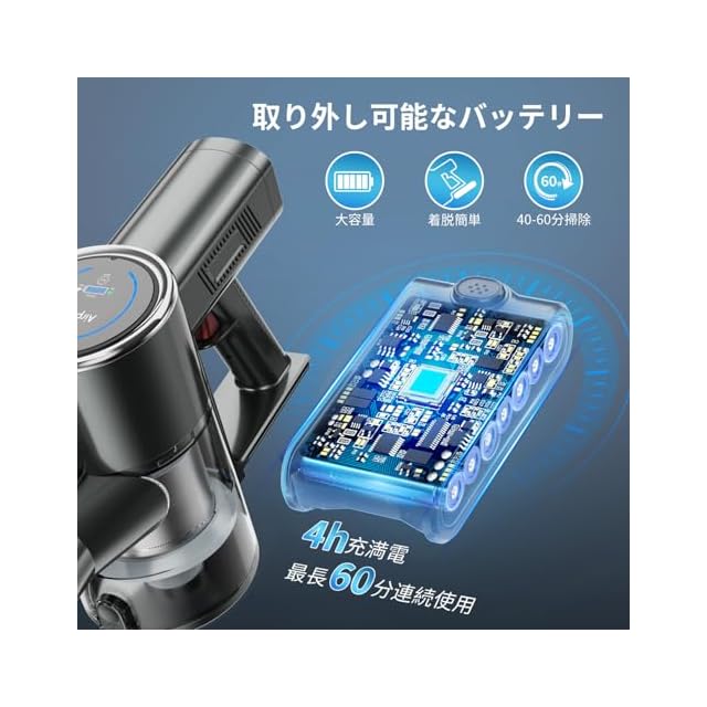 「1L大容量・着脱式バッテリー」ダストカップは1Lの大容量を持っていて、ワンタッチでゴミ捨てられ、1秒でゴミ捨て完成します。2500mAh リチウム充電式バッテリー7本を搭載し、わずか4-5時間の急速充電で、毎日の家庭の掃除で最大60分の連続稼働時間を提供できます。一人暮らしのお家から一戸建てまでどんなご家庭でも活躍します。また、掃除機の取り外し可能なバッテリーは、個別に充電および交換できます。充電方法は無制限であるだけでなく、長時間のお掃除でも途切れなく、予備バッテリーで復活できます。【予備用バッテリーの製品番号:B0CXT6LWMJ】