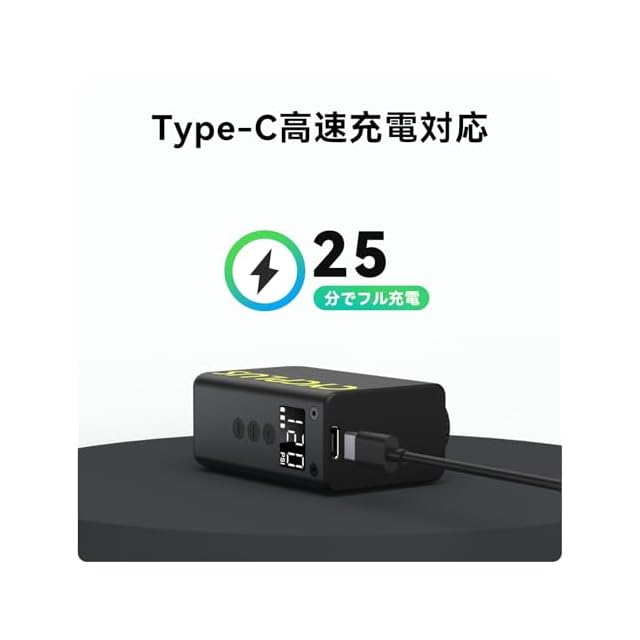 【急速充電対応】わずか約25分でフル充電が可能。満充電状態で、700×25Cタイヤを0〜80PSIまで少なくとも3本連続で充填できます。外出前の短時間充電にも便利です。