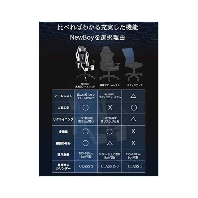 【長時間座っても疲れにくい】 NewBoyのゲーミングチェアはクッションが8cm厚さで丁度いい硬さあります。高密度な整形綿採用しており、体を安定させて激しいゲーミングの際にも安定感を保ち、お尻にかかる圧力を効果的に分散でき、より快適な座り心地を実現します。一日中座っても疲れにくいです。