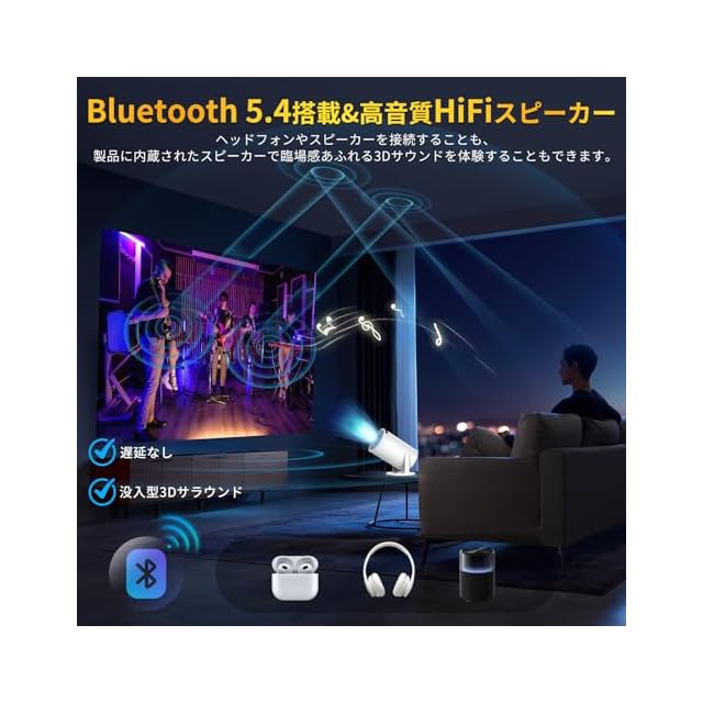 【超高速Wi-Fi 6・Bluetooth5.4・高音質HiFiスピーカー】この ぷろじえくたー 家庭用 は、高精度チップを搭載し、2.4GHz/5GHzデュアルバンドとWi-Fi 6をサポートします。強力かつ安定した超高速通信を実現します。iOS/Android/Windowsデバイス(スマホ/タブレット/PCのミラーリング対応)へワイヤレス接続が可能の プロジェクター 小型 で、遅延のないオンラインゲーム、映画、動画を快適に楽しむことができます。さらにBluetooth 5.4を内蔵し、お好みのスピーカーやワイヤレスヘッドホンに簡単接続します。高品質な内蔵Hi-Fiスピーカーと相まって、立体感豊かな3Dサウンドを再生します。まるでその場にいるような臨場感あふれる特別な体験をお届けします。