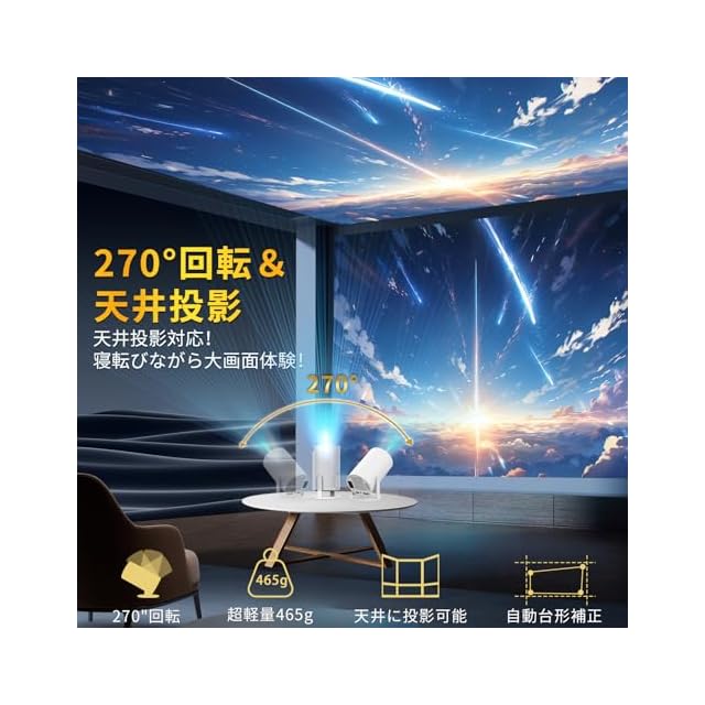 【270°回転・天井投影対応・自動台形補正】 270°回転するスタンド一体型で、三脚を使わずにスタンドを回転させて投影角度を選べます。また、プロジェクター 天井 は壁や天井に投影することもでき、座ったまま、寝転んだまま、横向きでもリラックスして視聴できます。さらに自動台形補正機能を搭載し、プロジェクターの角度を変えるだけで即座に補正します。それ以外、 天井 プロジェクター は手動台形補正機能も搭載しており、4面補正機能と連動し、リモコン操作で瞬時にスクリーンを長方形に補正し、あらゆる角度から最適な投写映像を実現します。