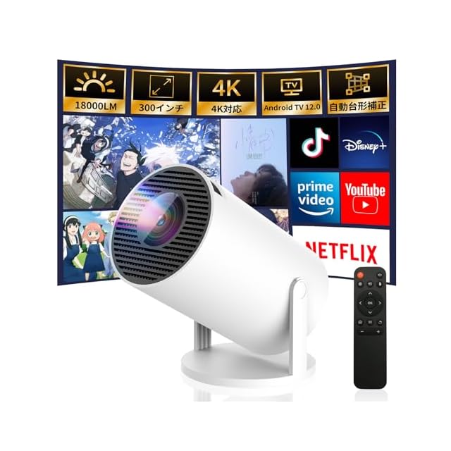商品名:【2025最新進化】 プロジェクター 家庭用 Android TV12.0 搭載 【4K対応・1080P・18000LM】 ショートスロー ぷろじえくたー 家庭用 小型 270°回転可能&天井投影 ホームシアター Wi-Fi6 Bluetooth5.4 HiFiスピーカー スタンド一体型 短距離投影 自動台形補正 操作簡単 パソコン/スマホ/Switch/PS機/DVD接続可 日本語取扱説明書
