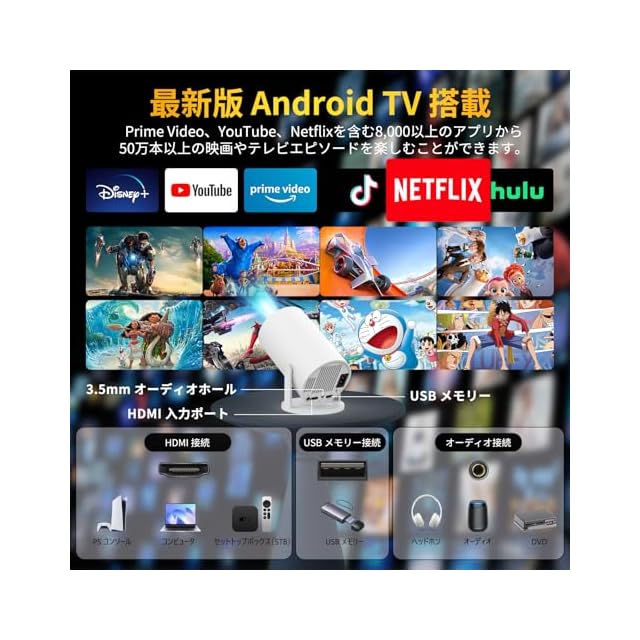 【Android TV搭載・ショートスロー・大画面】 ホームプロジェクターに内蔵されたAndroid TV12.0では、Prime Video、YouTube、Netflixを含む8,000以上のアプリから50万本以上の映画やテレビエピソードを楽しむことができます。要件に応じて Google PlayストアやApp Store から豊富なアプリをダウンロードでき、お気に入りの映画やテレビ番組を家族や友人と一緒に楽しむことができます。それ以外、 プロジェクター 家庭用 はショートスロー技術により、手軽に50インチから300インチまでの大画面で楽しめます。※アップデート時にアンインストールする必要はなく、アップデートするかどうかを選択するだけでいいです。※一部のアプリケーションや映画・テレビセレクションでは、リモコンのマウスモード選択を切り替える必要があります。